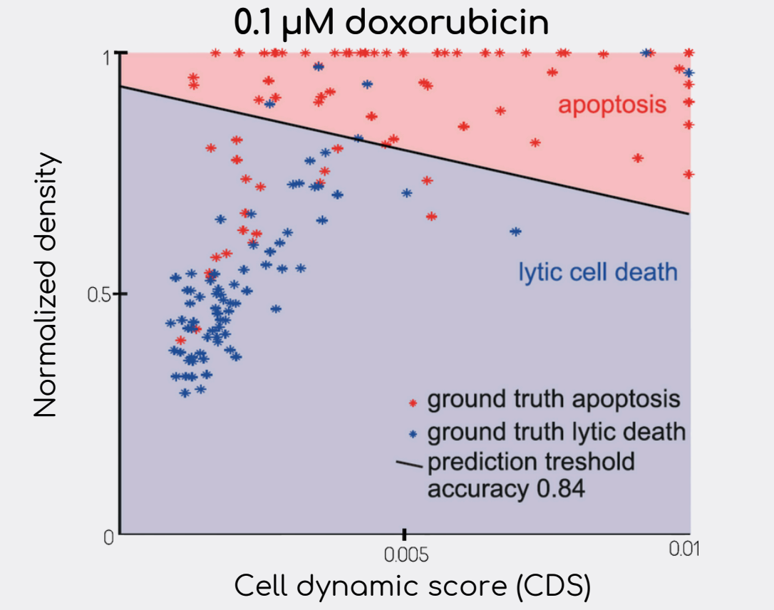 This study highlights an example of how AI models trained on QPI data can automatically detect and classify cell death [2]. Scientists applied the long short-term memory (LSTM) neural network to automatically detect the time point of cell death from extracted features (mass, area, density, etc.) of segmented and tracked LNCaP, DU-145, and PNT1A cells. For cell death type classification, only two features were selected: mass density (pg/pixel) and cell dynamic score (CDS), features introduced by the authors. These features served as an input for the machine learning algorithm for cell death distinction. As a result, their method identified cell death subroutines based on patterns in the time-lapse QPI data, achieving 75.6 % accuracy for DU-145 cells compared to a manual detection method depending on fluorescence signal analysis.