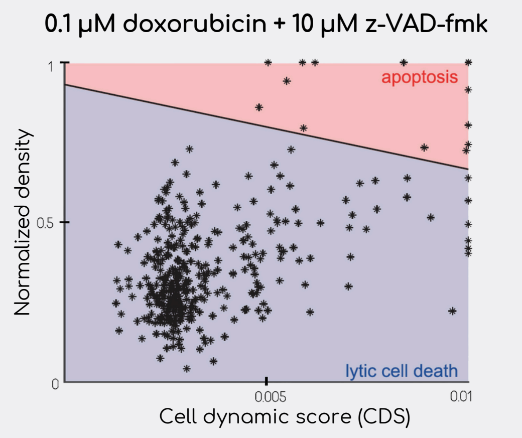 Classification of DU-145 cells based on an automatic detection method without manual annotation. Each point represents one cell (N = 381). Inhibitor of apoptosis z-VAD-fmk causes increased progression of lytic cell death (necrosis). Original graph from [2].